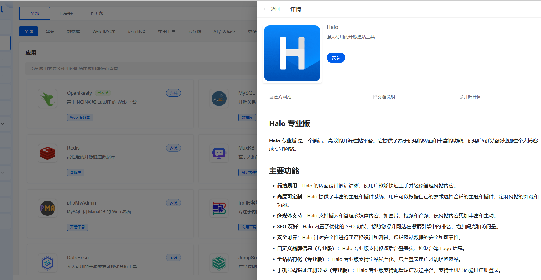 在1panel中安装halo